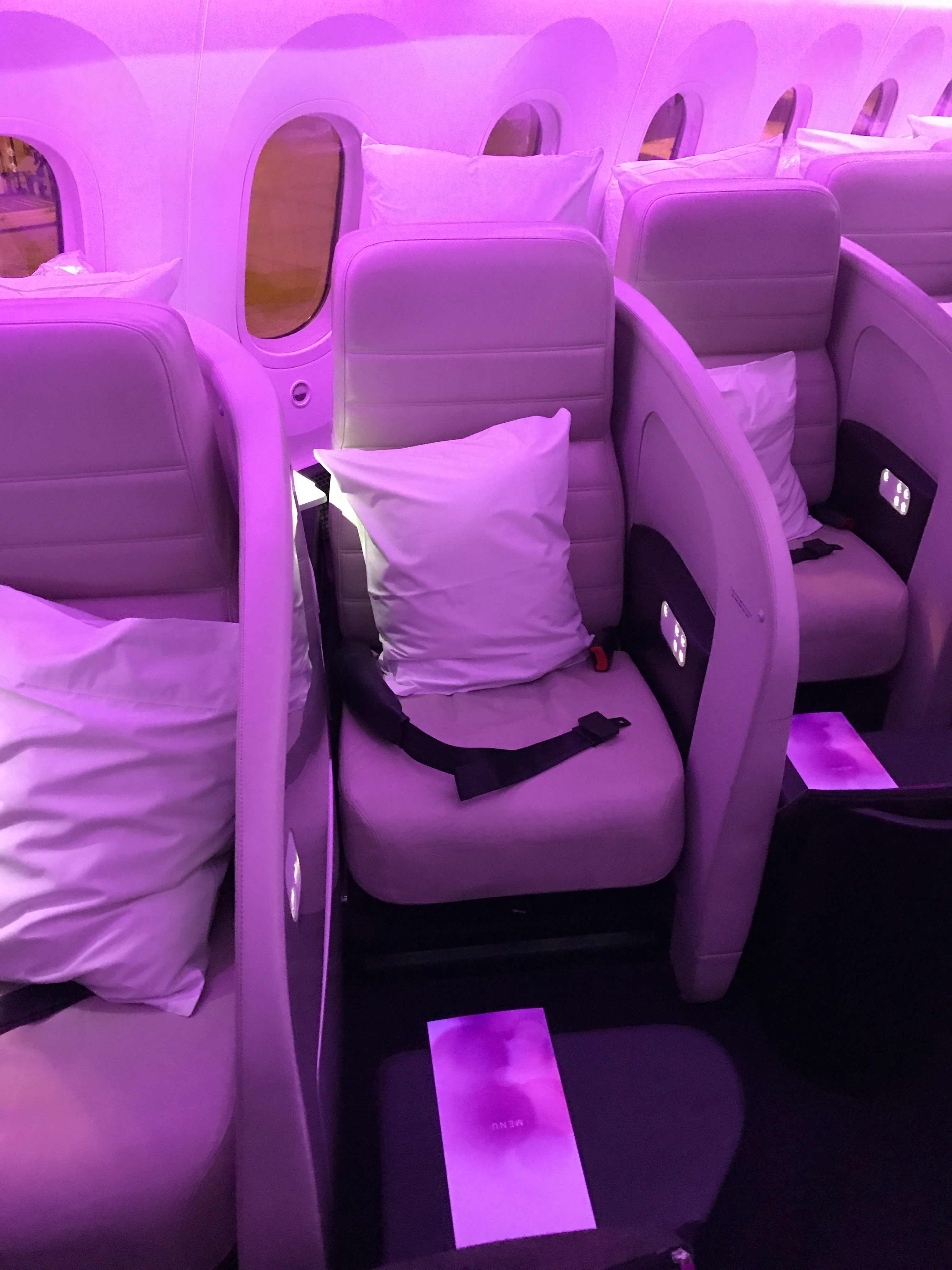 Whoa. Business class is pretty tight. I wonder what first class looks like. Was the light actually pink ? Ugh. Disappointing.
