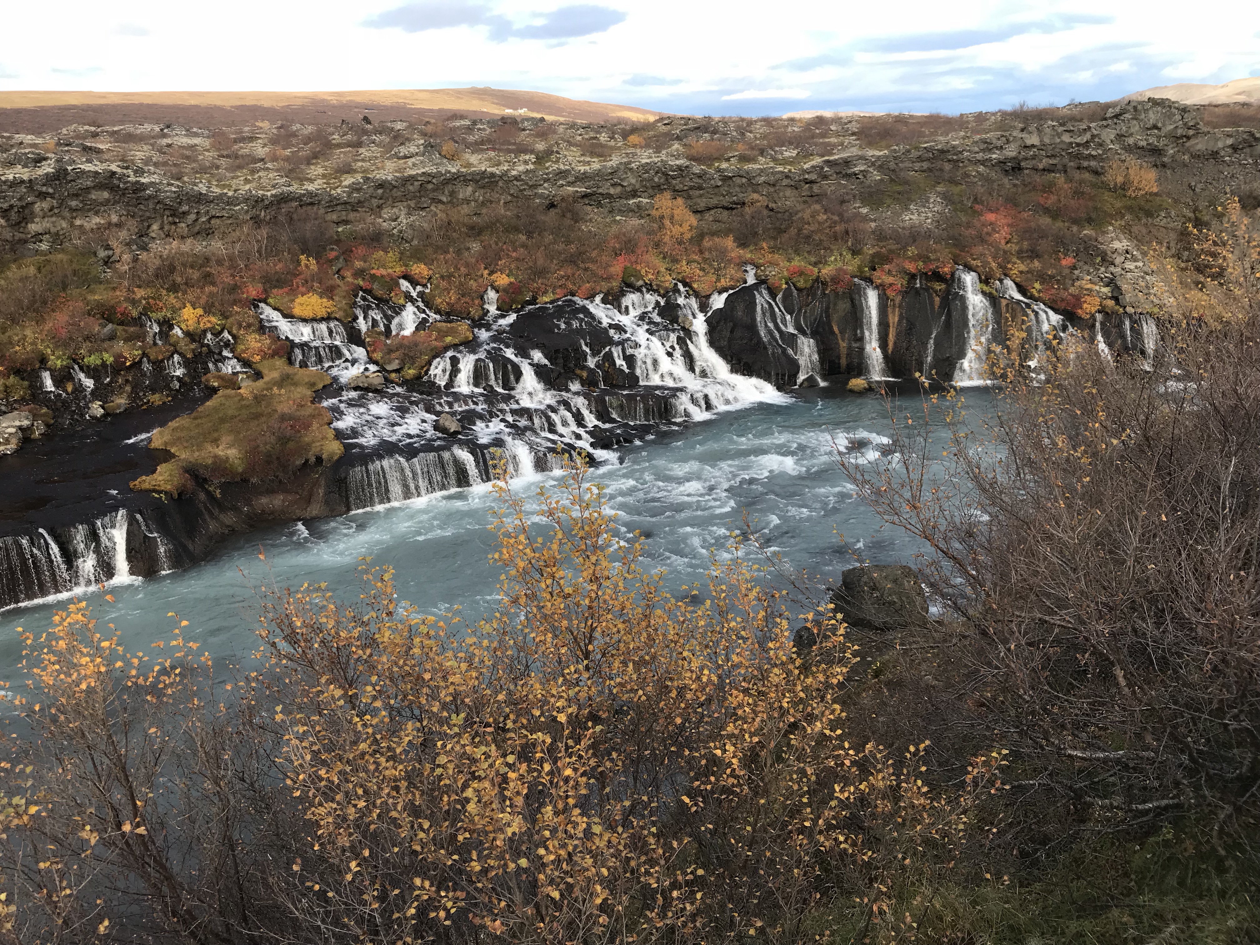 Hraunfossar is a natural miracle as natural springs cascade water drum under the surface down volcanic cliffs int to river. The magic was further enhanced by the beautiful fall colors of the arctic birch and r fish shrubs.