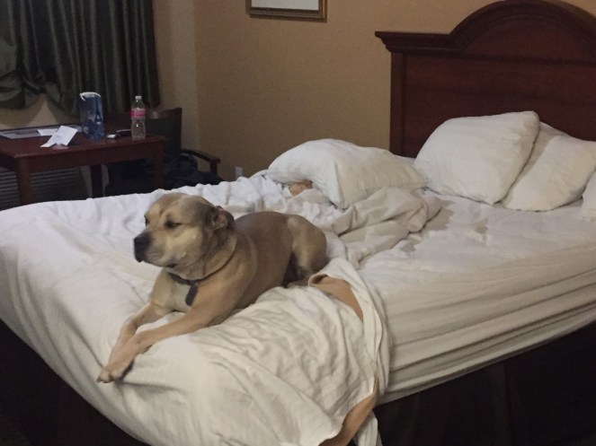 It’s a bit of a chore to drive with a dog, especially a pit, as very few hotels accept them. Fortunately Best Western does and for a $20 Fe, our princess got a choice of two queen size beds to choose from.