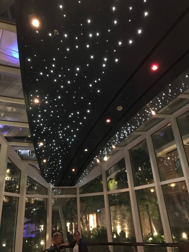 So far, our experiences have been great. That includes the rising Rose’s bar we floated on up and down between decks 8 amd 5 last night.