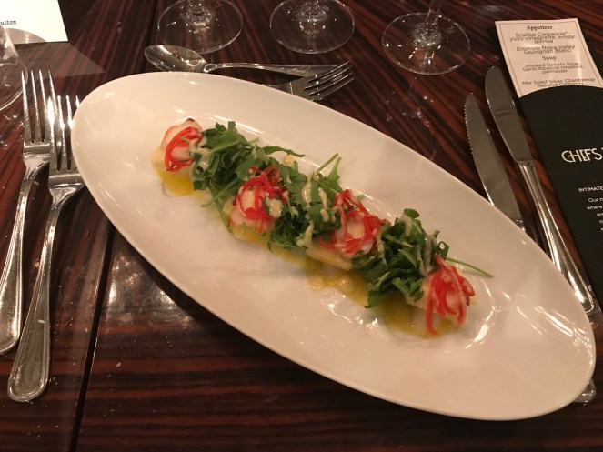 From top to bottom, our meal began with a scallop carpaccio with Yuzu vinaigrette. The course was paired with a Sauvignon blanc from Northern California.