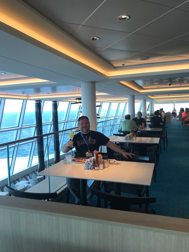 Breakfast is served at the serene garden cafe in high atop the bow of Bliss. A truly innovative location that stands in well appreciated contrast to all other mass market vessels where the buffet is stuck aft.