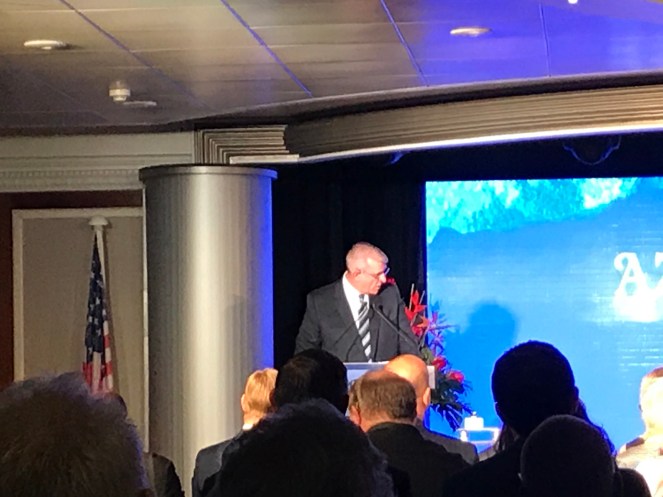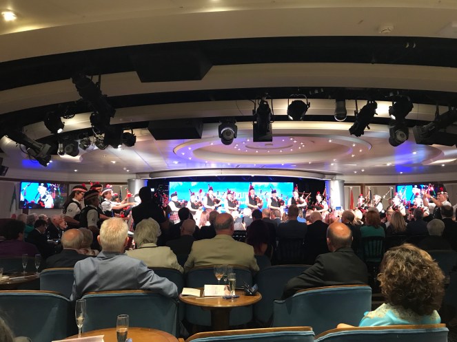 Life raft drill completed, guests gathered in the main lounge for the naming ceremony at 5PM local time. Complete with Color Guard and the traditional smashing of Champagne, the Azamara Pursuit was christened with two god mothers, Ellen Asmodeo-Giglio and Lucy Huxley, both legends in the travel industry.