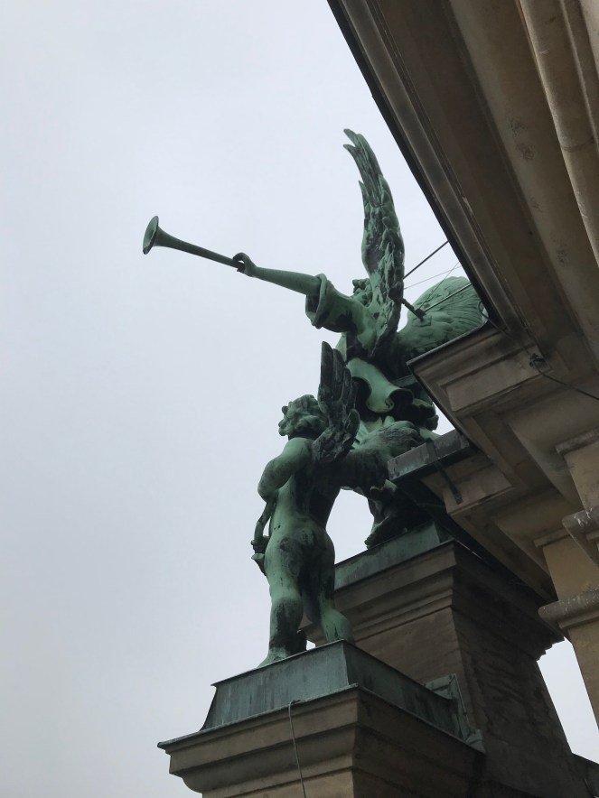 A 182 step climb up into the cupola offers panoramic views of the city as seen below with trumpeting angel and a view of Alexanderplatz with the Berlin City Hall.