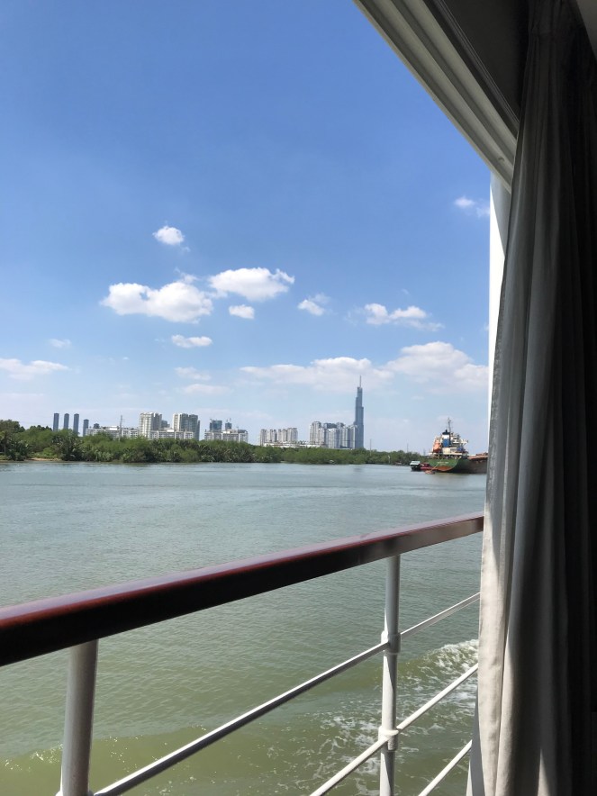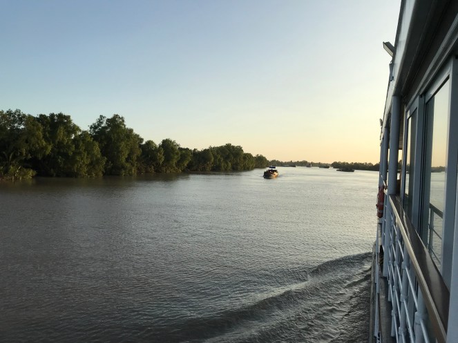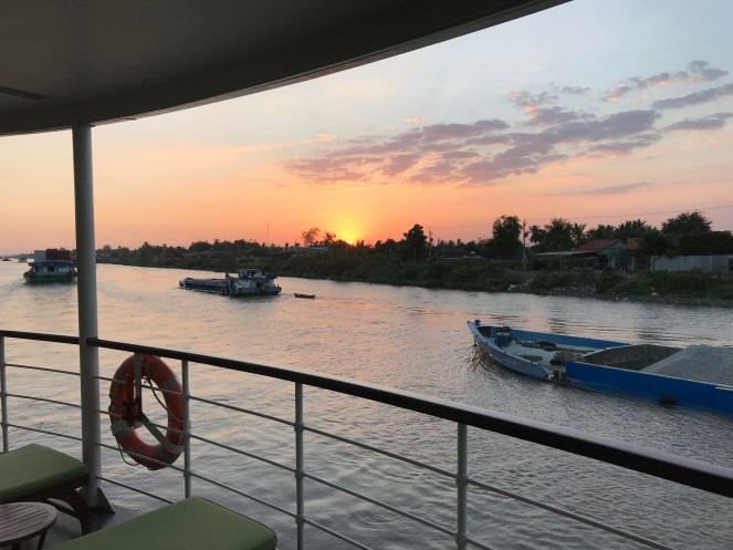 Peacefully gliding down river, away from the bustle of Saigon (top photo with skyline) we eventually reached the straight stretch of the Mekong with its myriad of boats transporting anything imaginable up and down river (middle). The sunset (bottom) only enhanced that magical setting of steady industriousness.
