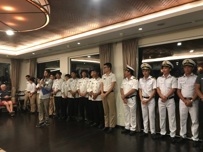 Our family away from home for the past 7 days celebrated with us for a farewell dinner and reception. While the staff is predominately Cambodian, the navigational crew is Vietnamese but all shared in the warm and welcoming professionalism that made this cruise an outstanding experience. Caring, compassionate, and efficient, these team members made our journey exceptional every step of the way. I might add that we all wanted to adopt them for our own homes – they were that special to us all.