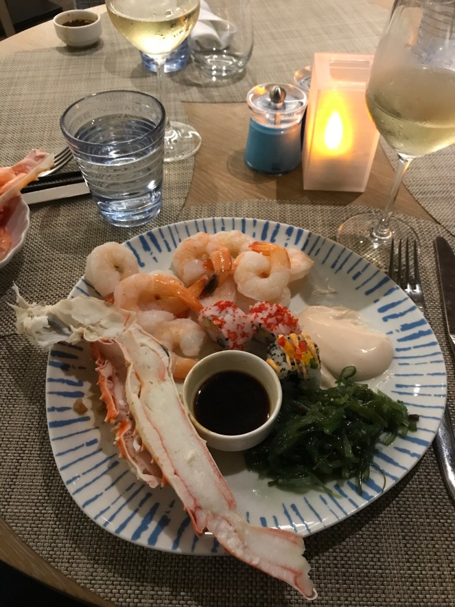 From the top, the fabulous salmon and dill eggs benedict, seafood buffet at World Cafe (offered daily), and the tasty beef Wellington are just a few samples of our tasty meals so far. Note also that wine and beer are covered at meal times – I call it the bottomless glass – which is a big plus.
