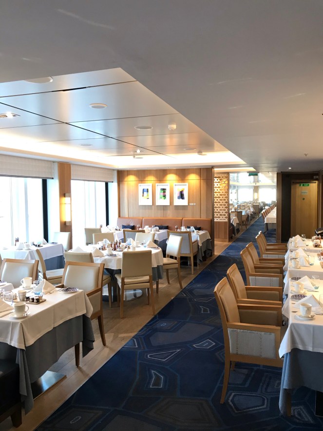 The modern, yet cozy feel permeates the entire ship. From the bar in the main dining room to the tables in cozy groupings, each with comfy chairs and plush pillows, makes me feel right at home.