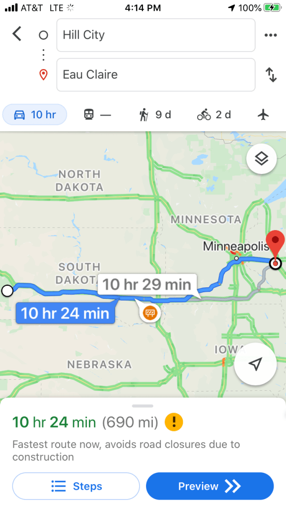 To accomplish our “monster” driving day of 700+ miles, we got an early start at 630am. Heading east out of the Black Hills to the seemingly endless Prairie of flat corn and soy fields – Interstate 94 due East took us to Sioux Falls for a quick stop and then on to Minnesota.