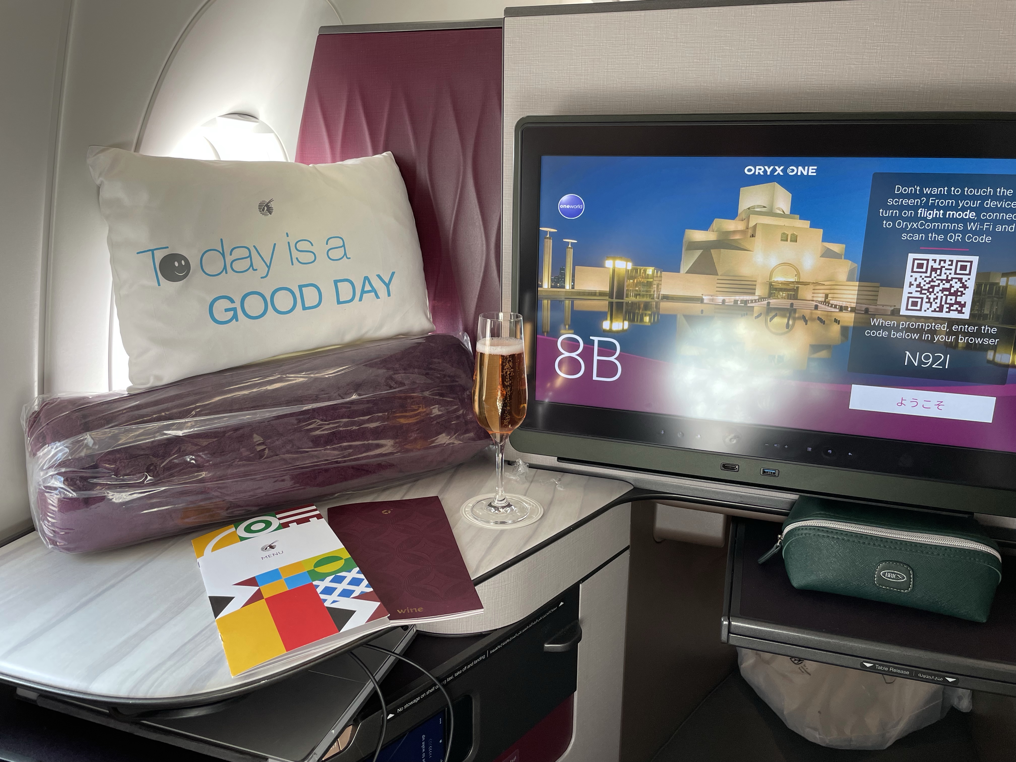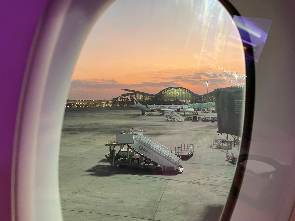 Our first leg from San Francisco to Doha runs 16 hours over the North Pole on a brand new Airbus 350-1000 – the new gold standard in flying. Watar Airways has been named the winner of Skytrax best business class for two years running and my seat called Q-Suite is absolutely stunning. Tons of space, nifty details, and attentive service make this a treat to remember for a long time.