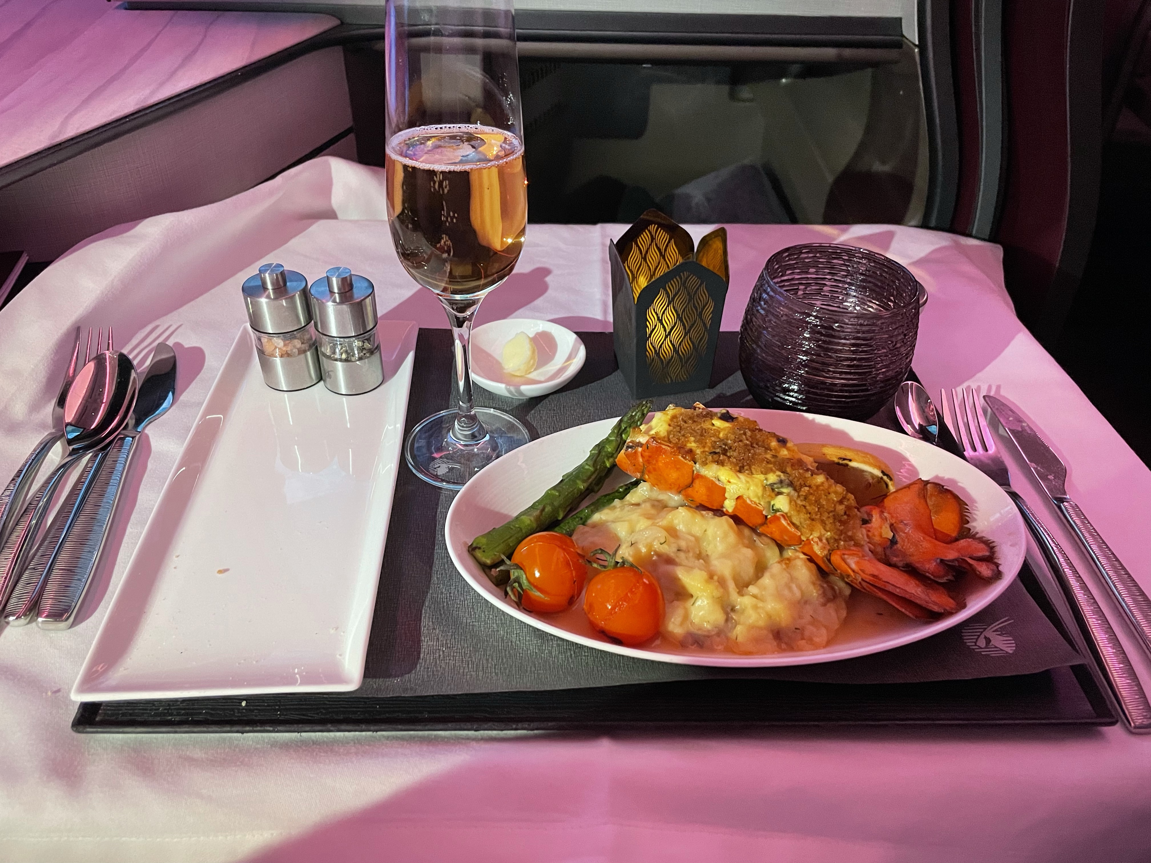 The meal selection read like a Michelin star restaurant and the taste was on par as well. Impressive for airplane preparation! Of course, the wine and cocktails matched the food and tons of entertainment options were also on offer. All in all, a class-leading experience for guests traveling to Asia and Africa.