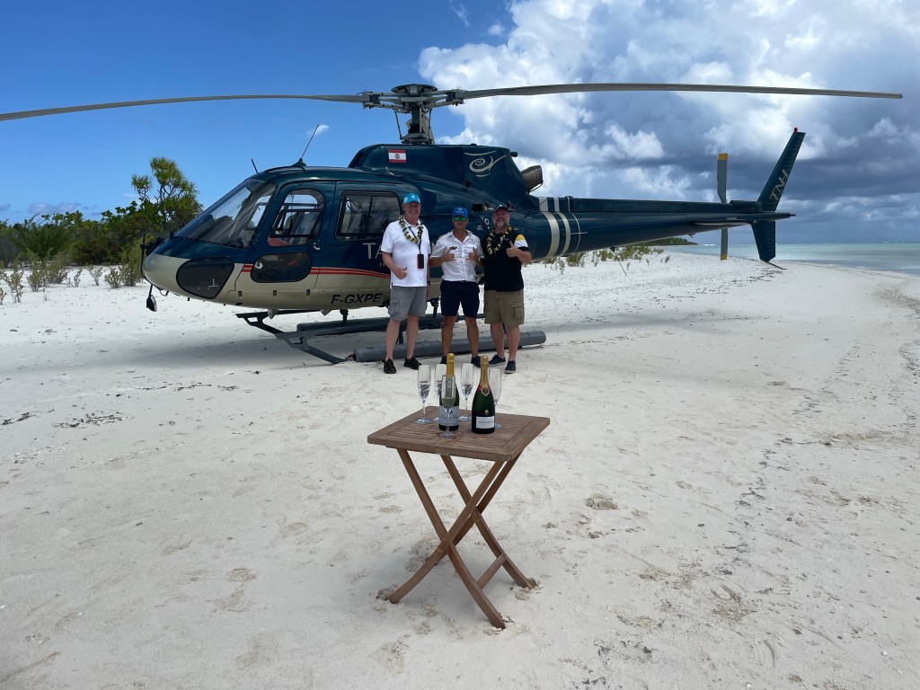 Five guests, me among them were strapped tightly in seats of the Thahiti Nui Helicopter for a circular island flight with landing on Tupai atoll – an uninhabited heart shaped island a few miles off Bora Bora. Not only did we land on the atoll, we were met with a bottle of bubbly (actually 2) which our pilot set up for us on a table with real glasses.