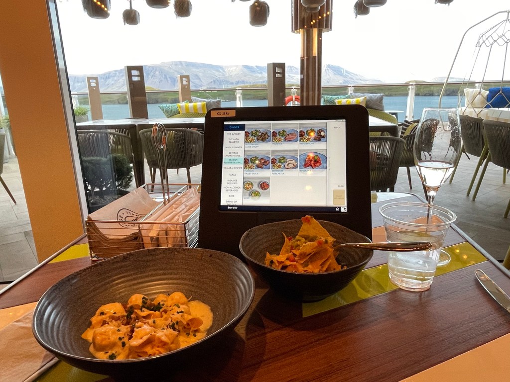 In essence, Indulge Food Hall is your complementary food truck heaven offering 11 diverse culinary venues: Coco’s, Q Texas Smokehouse, Starbucks, Seaside Rotisserie, Nudls, Tamara, The Latin Quarter, Tapas Food Truck, Garden Kitchen, Just Desserts, and Just Ice Cream. Guests order at their table on a tablet and a few minutes late the plates arrive. Pro tip: Stagger your orders or you have appetizers, main courses, and desserts all at once.