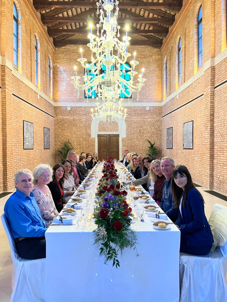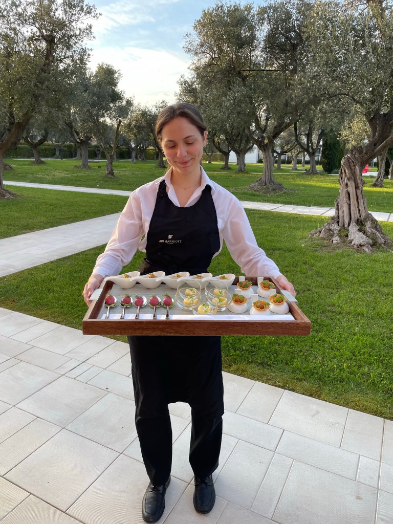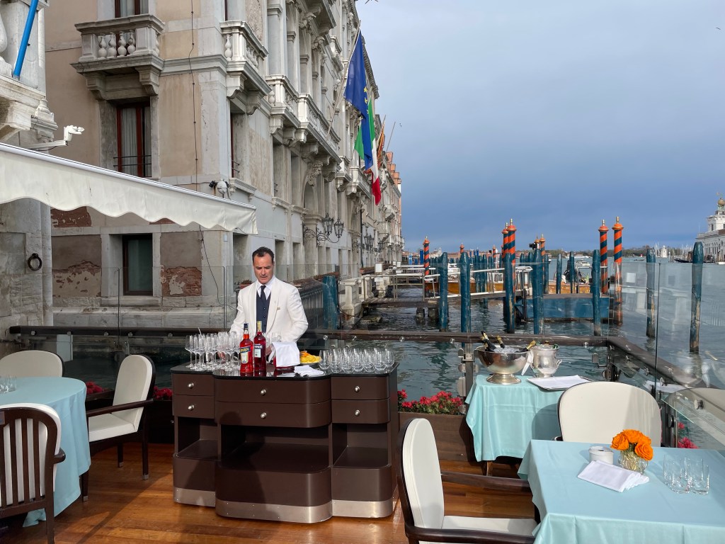 With three nights in town, we experienced three different bar setups. The first night’s reception at the St. Regis was indoors with choice of Prosecco, Aperol Spritz, or Campari. The second night (pictured above) came with red or white wine, select spritz, and Italian cranberry gin. Our final reception at the JW Marriott last night had those choices as well as a fresh raspberry Bellini. What united all three settings was the Venetian principle of aligning the evening’s energy before a meal.