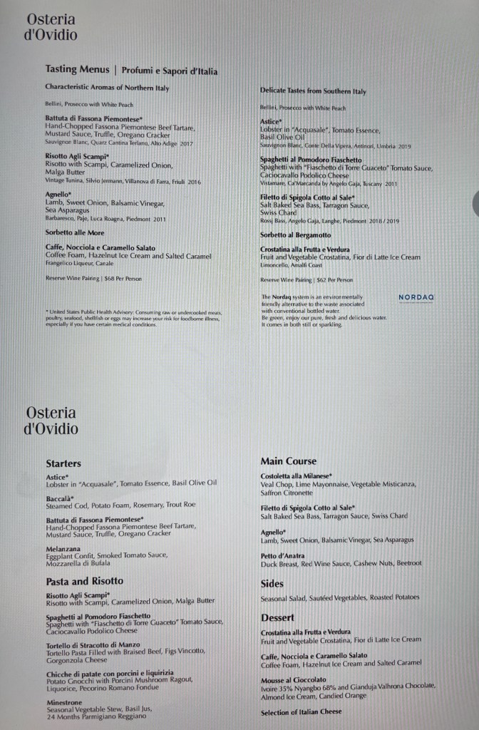 Another positive change is the evolution of Prego to the new “Osteria d’Ovidio” – a Michelin inspired Italian concept honoring the new co-chairman of Crystal Manfredi Lefebvre d’Ovidio and his Italian roots. I personally loved this creative Puglian chef created menu (See below) that juxtaposes northern and southern Italian dishes.