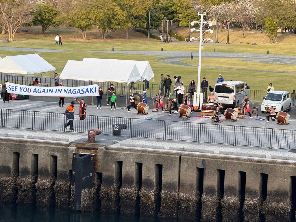 Our tour of Japan continued with a stop at the beautiful port of Nagasaki (site of the 2nd nuclear bomb dropped 3 days later than Hiroshima’s. This small town was actually not the intended target but bad weather led to a last minute decision to try to destroy Mitsubishi Shipyards instead of Karatsu.